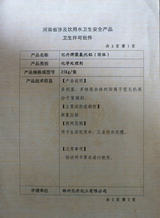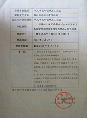 產(chǎn)品衛(wèi)生許可批件: